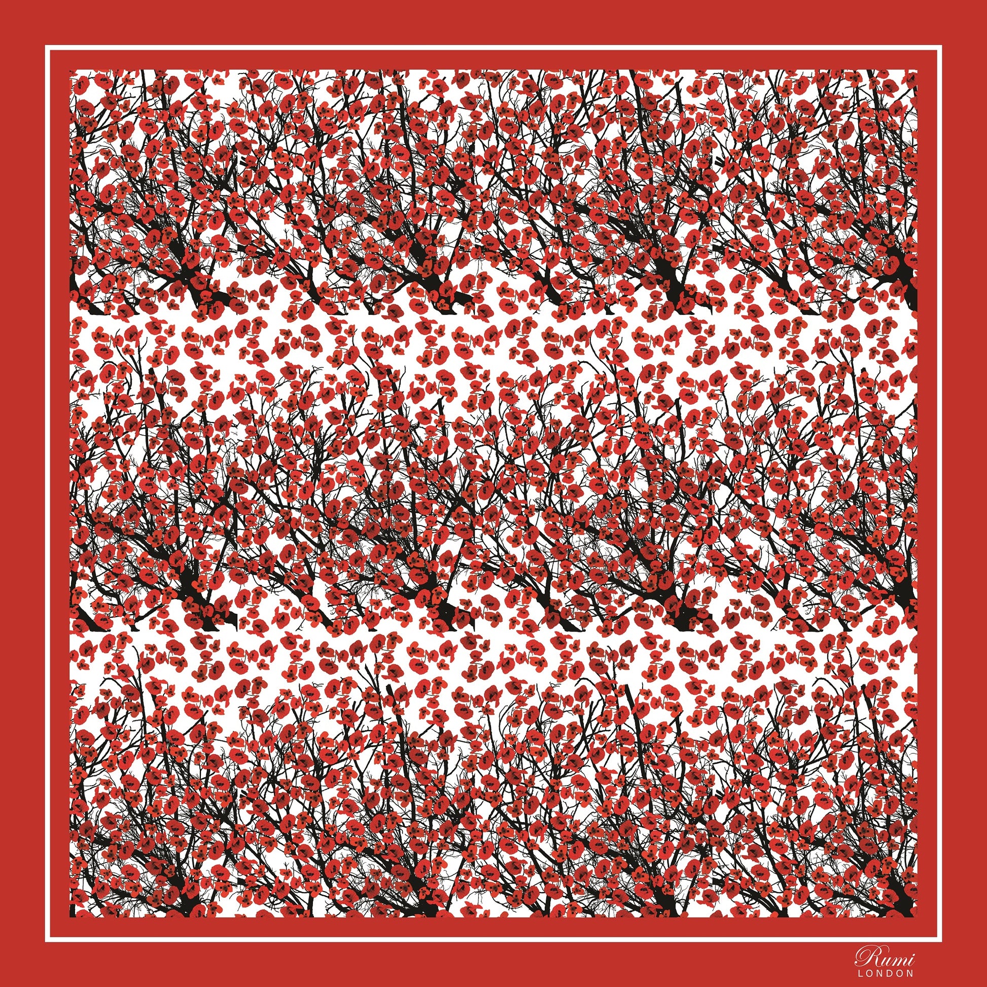 This Scattered Poppies Luxury Silk Scarf is the perfect finishing touch to any Spring/Summer outfit. The colourful square silk scarf is crafted from 100% silk. Boasting a bold print all over with branding to the edge, this luxury scarf is complete with hand-rolled edges. The silk scarf features numerous scattered red poppies and swinging branches against a plain white background complete with thick red borders.
